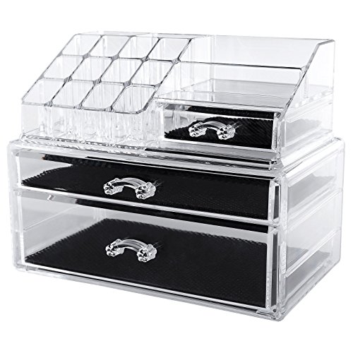 Sehr funktionell, Aufbewahrungswunder - Darin lässt sich eine Vielzahl von Utensilien sortiert unterbringen. Auf die oberen 16 Fächer, die verschiedene Höhen und Größen haben, können Sie Ihre Lippenstifte, Schminkpinsel, Mascara, Augenbrauenstifte, Eyeliner usw. immer standfest stellen, während Ihre Schmuckstücke oder das diverse Schminkwerkzeug in verschiedenen Größen in die drei Schubladen mit verschiedenen Höhen perfekt ihren Platz finden, und vor Staub geschützt bleiben
